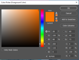 - Click the Foreground Color Swatch. For example:Select a bright orange from the color picker (Try R=250, G=116, B=0) and click OK.